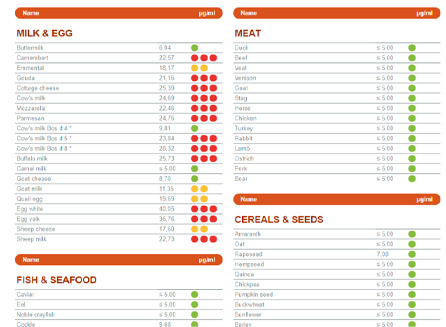 буйволиное молоко, пахта, верблюжье молоко, камамбер, творог, коровье молоко, яичный белок, яичный желток, сыр Эмменталь, козий сыр, козье молоко, сыр Гауда, сыр Моцарелла, сыр Пармезан, перепелиное яйцо, овечий сыр, овечье молоко